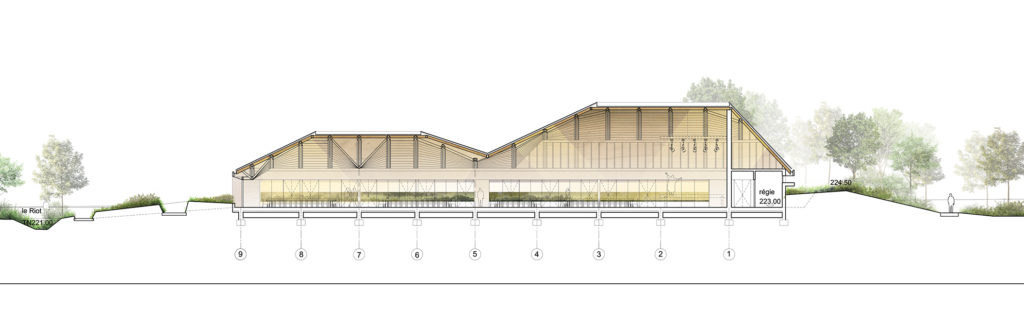 Elle se décline pour former une composition quadripartite intégrant la grande salle, les deux petites salles, le hall d’accueil et ses services, les locaux techniques et logistiques