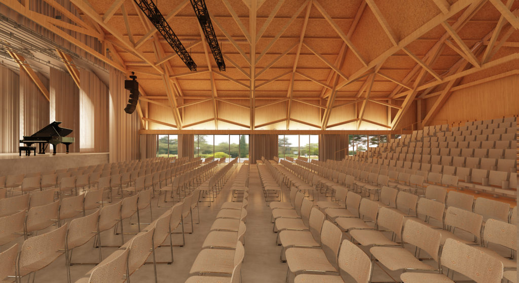 En termes d’aménagement intérieur, le bâtiment comprend un hall modulable en deux parties, conçu entièrement en bois, permettant une utilisation flexible tout en limitant l’accès public au strict nécessaire. La grande salle peut être divisée en trois parties indépendantes, offrant une polyvalence d’usages de jour comme de nuit, avec une vue dégagée sur le paysage environnant. Le choix de limiter le bâtiment au rez-de-chaussée permet une économie d’espace, avec l’utilisation des combles pour des doubles hauteurs et des locaux techniques.
